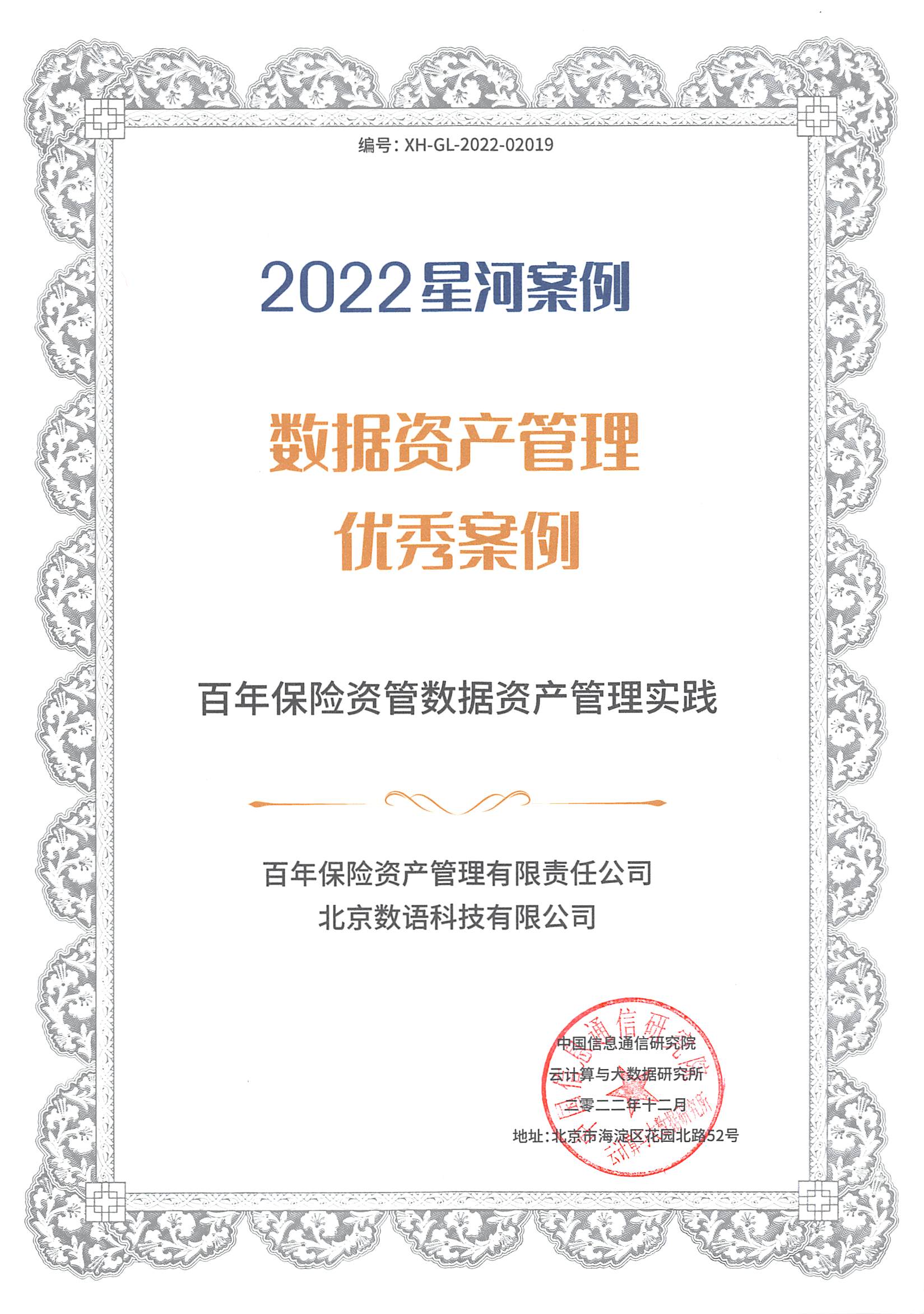百年保险资管公司“数据资产管理实践项目”荣获“2022大数据星河案例”数据资产管理优秀案例奖