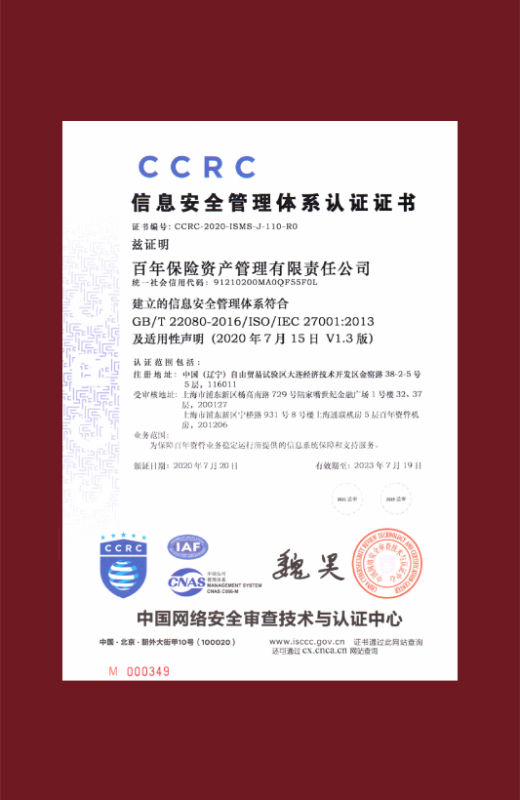 百年保险资管荣获“ISO27001信息安全管理体系认证证书”